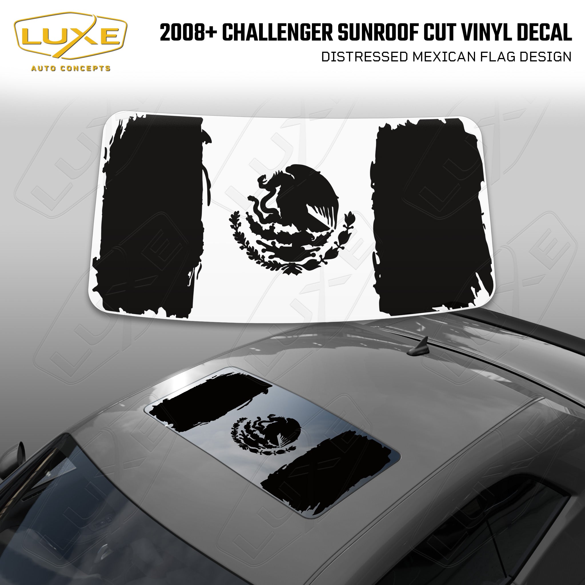 Introducing our Distressed Mexican Flag design for the Challenger sunroof, made with high-quality matte black vinyl that's guaranteed to make your...