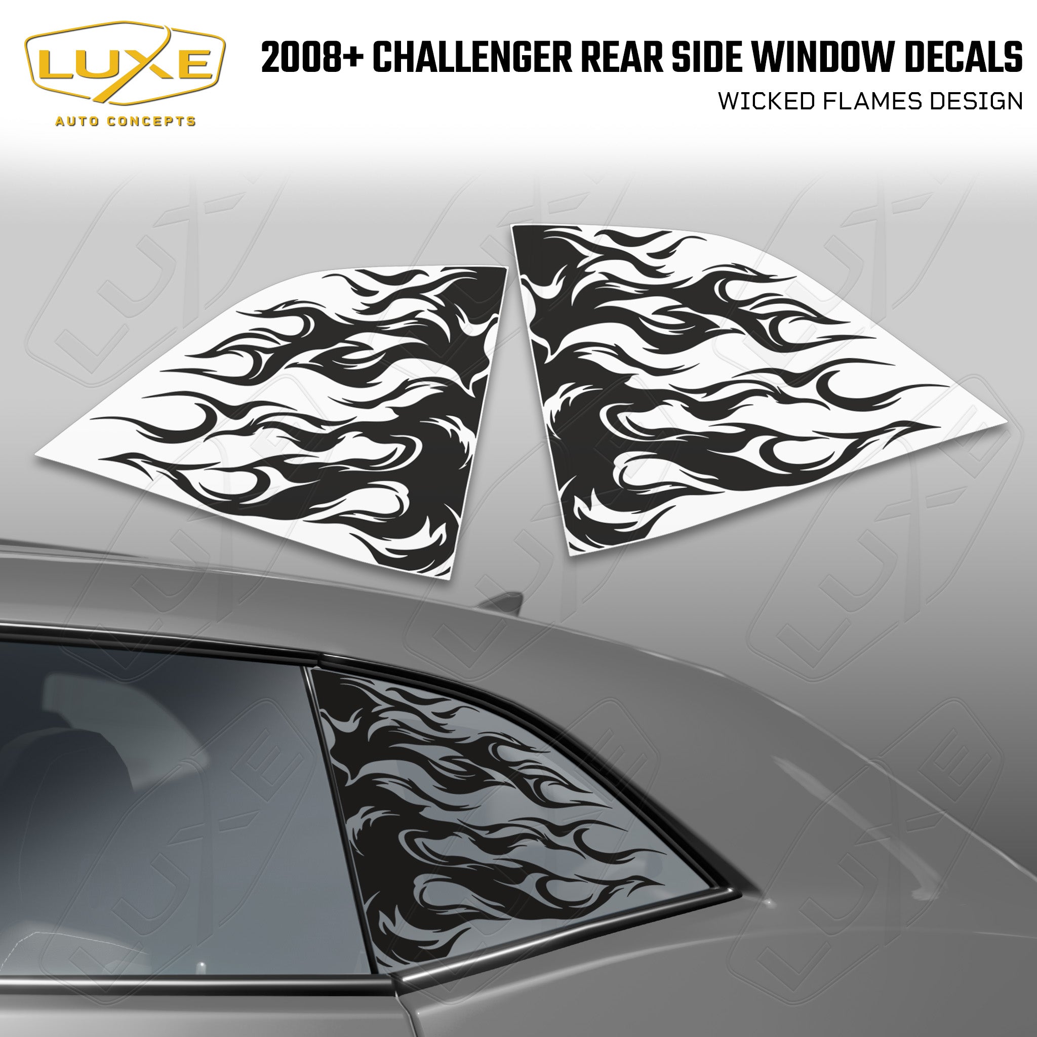 Description Fitment Introducing our wicked flames design for the Challenger rear side glass, made with high-quality matte black vinyl that's guaranteed to...