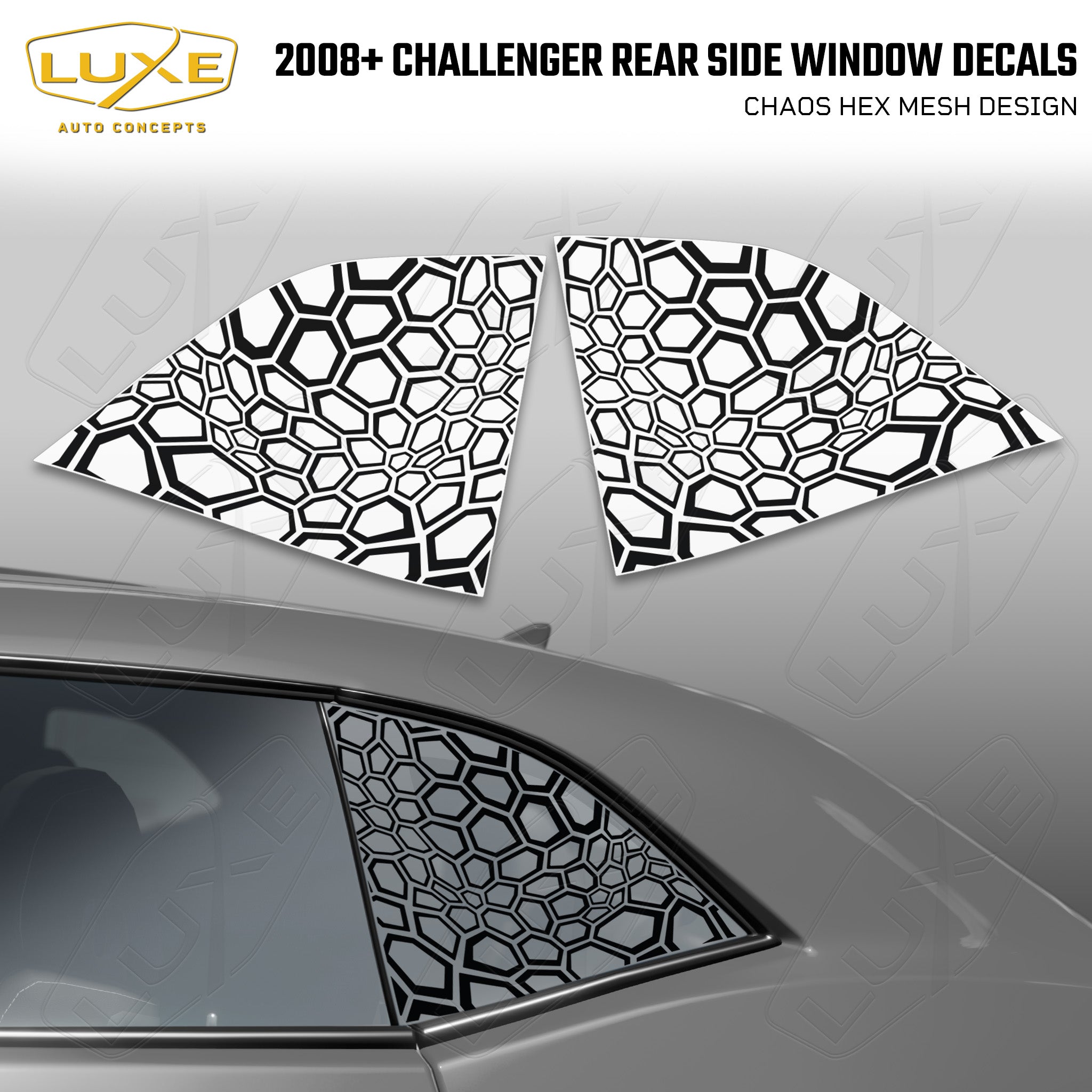2008+ challenger rear quarter window cut vinyl decals - chaos hex mesh design