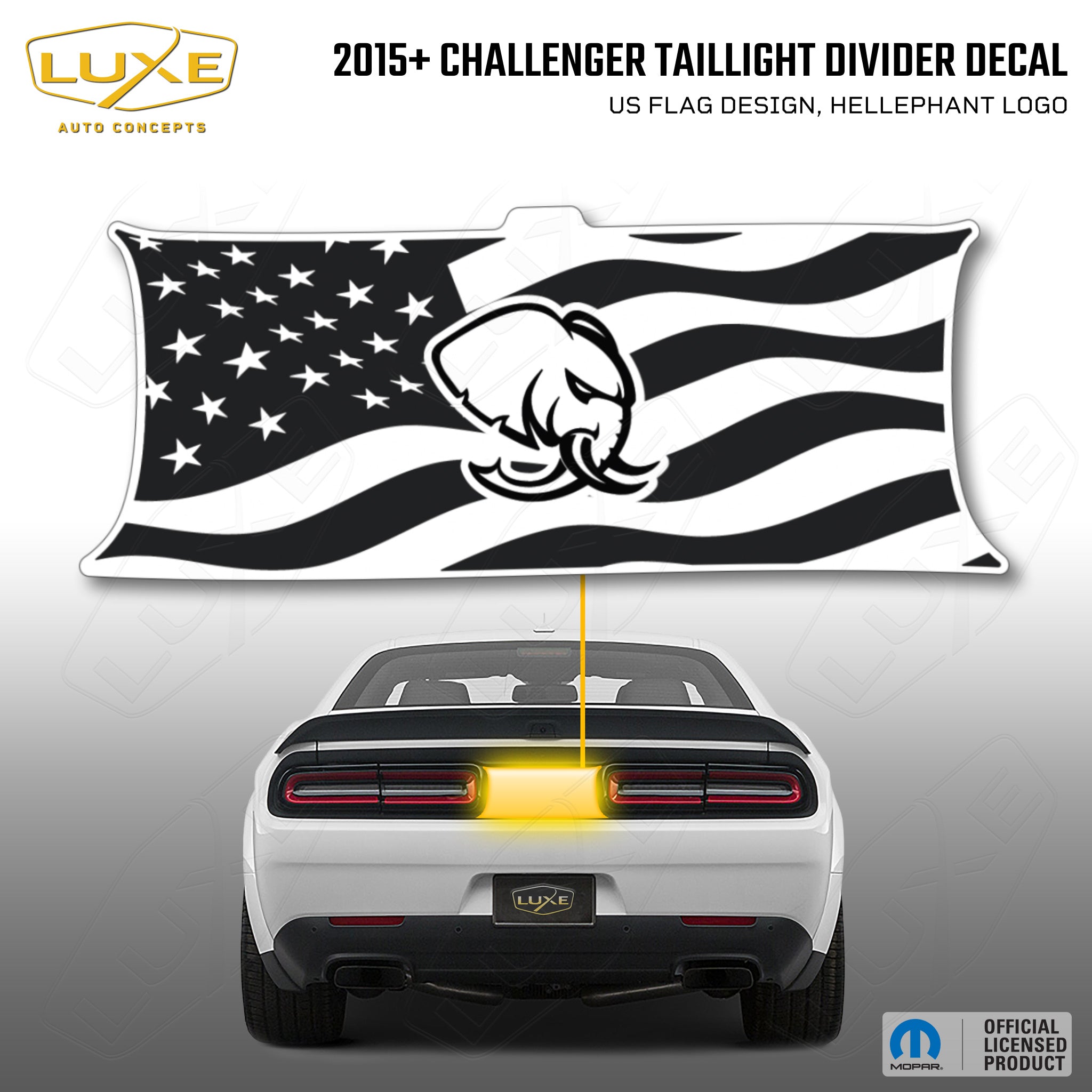 2015+ challenger taillight center divider decal - us flag design, hellephant logo kit