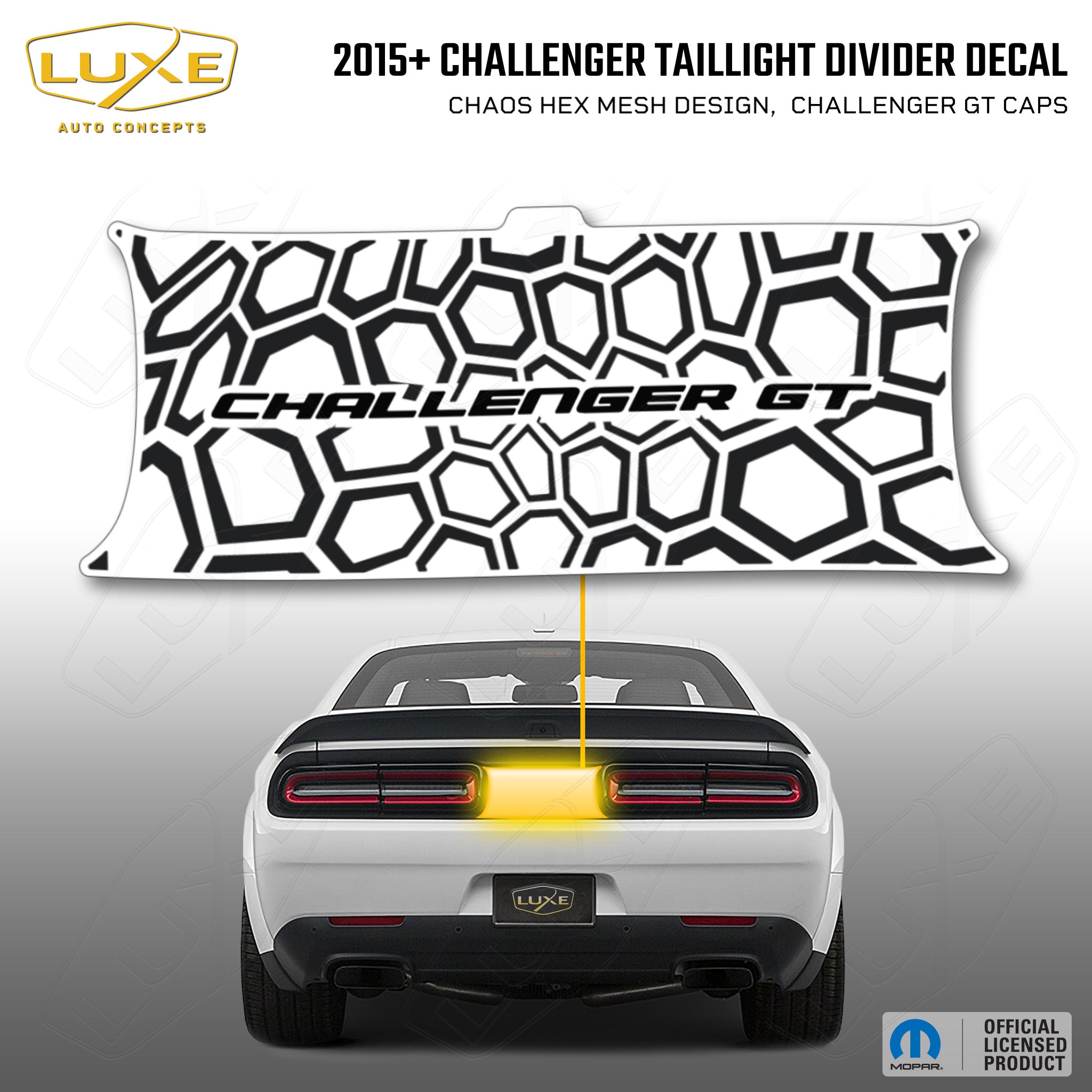 2015+ challenger taillight center divider decal - chaos hex mesh design, challenger gt caps logo kit