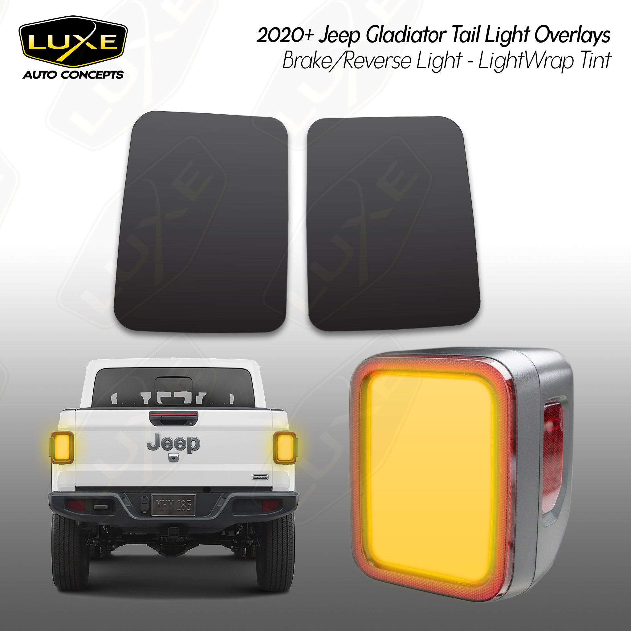 This 2-piece tail light brake & reverse light tint kit includes custom fit overlays for your 2020+ Jeep Gladiator.  Everything from the shape of the overlay to the choice of quality vinyl is designed by Luxe to be the best on the market.  We make these overlays using the same cast vinyl you'll find in professional shops around the world.  It will not shrink and crack like calendar vinyl or Chinese-made vinyl, and can be removed without causing any damage to the vehicle.