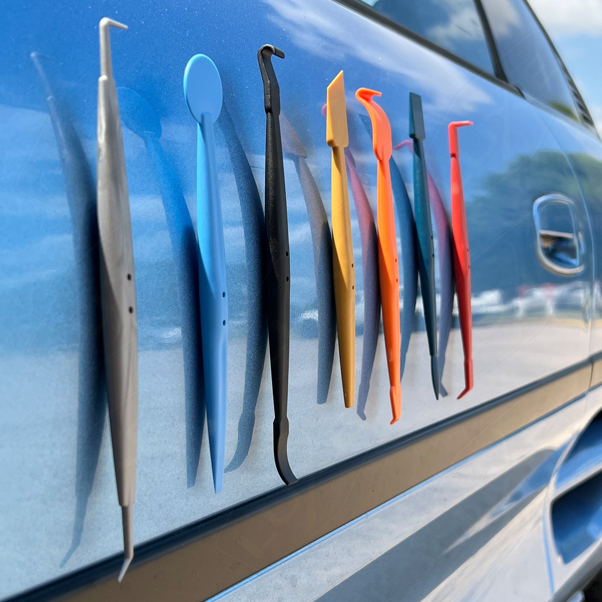 Our Multi-Tool Magnetic Squeegee Sticks are designed to make wrapping easier and more fun! Each squeegee stick features a different tool on the end to help with different scenarios that can be frustrating to wrap successfully. The sticks also have embedded magnets so they will stay easily within your reach and undamaged. We recommend these tools for anyone who is installing LightWrap for friends or professionally, as lights vary greatly on different vehicle models.
