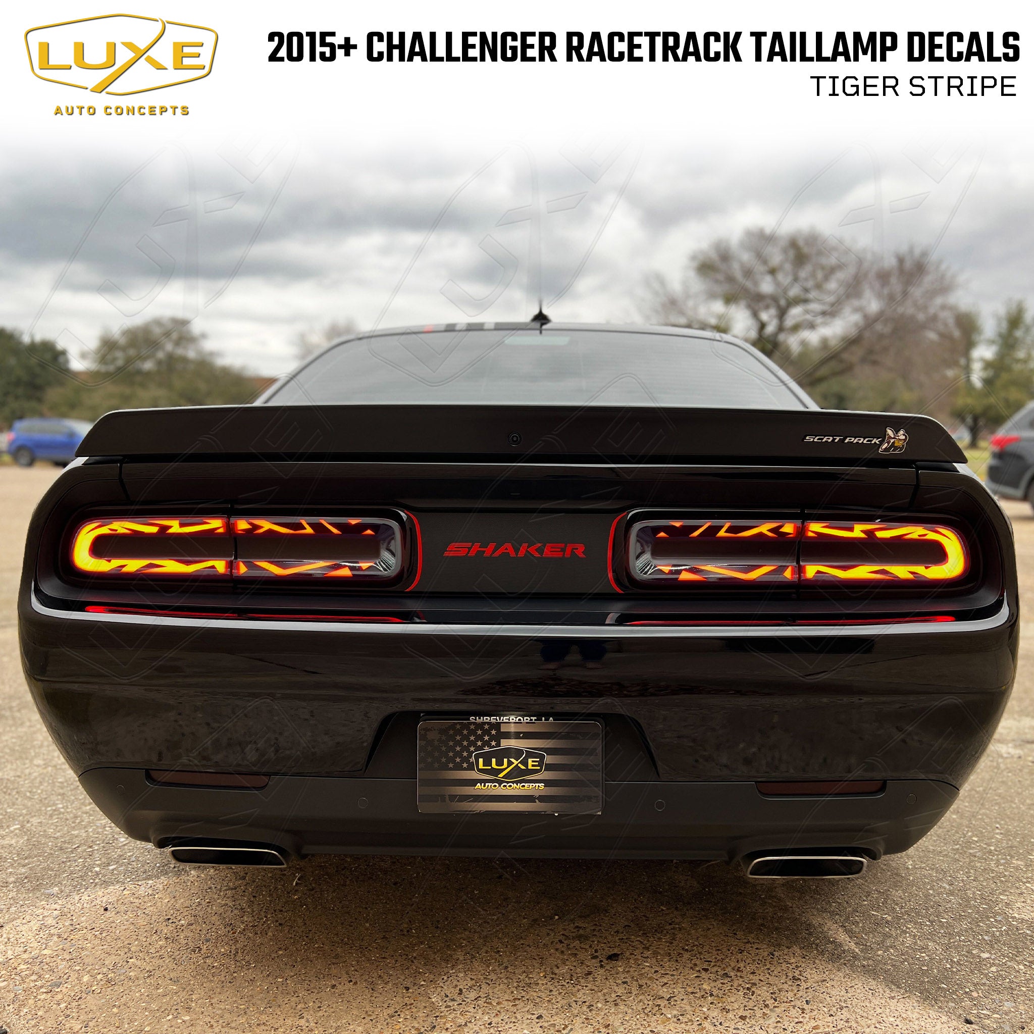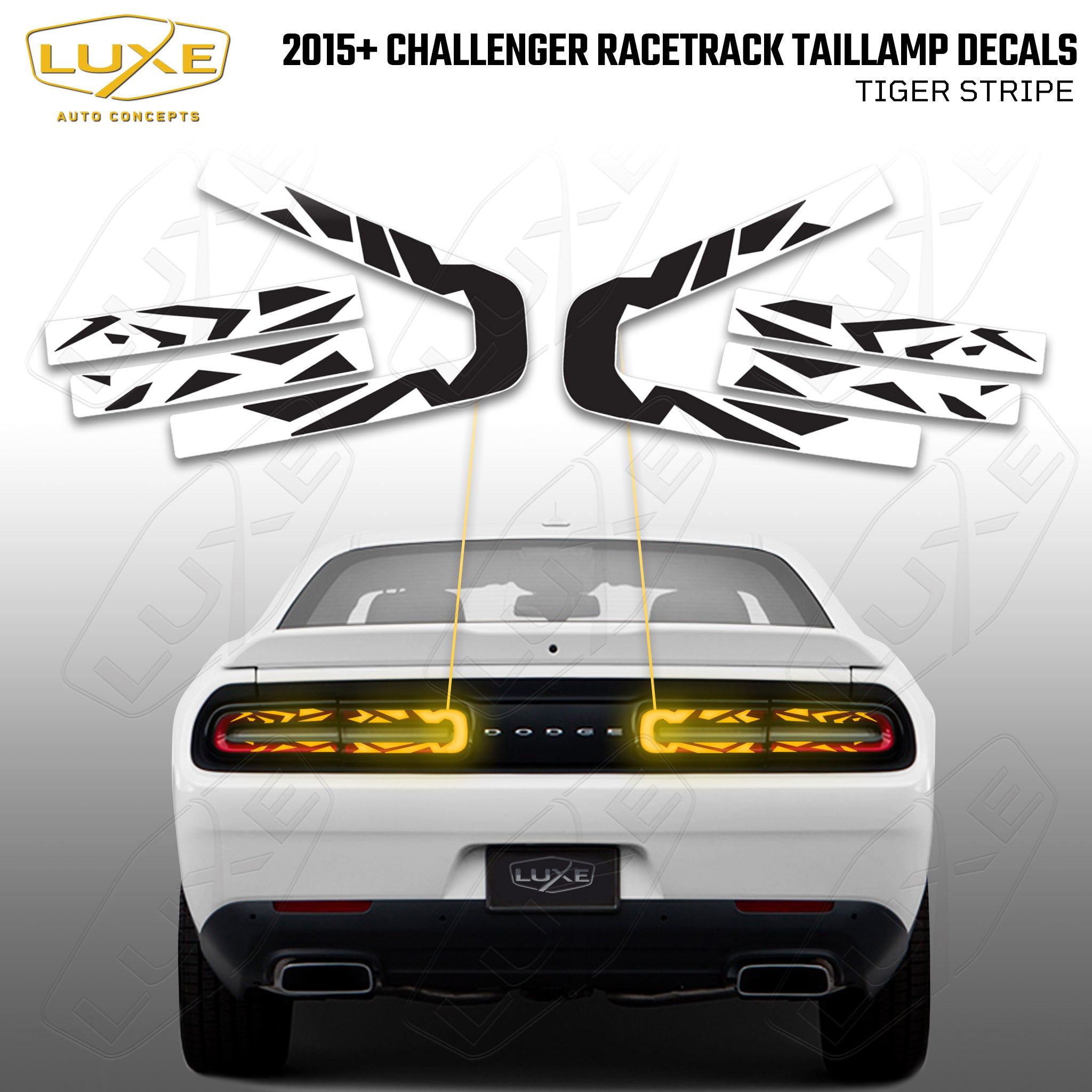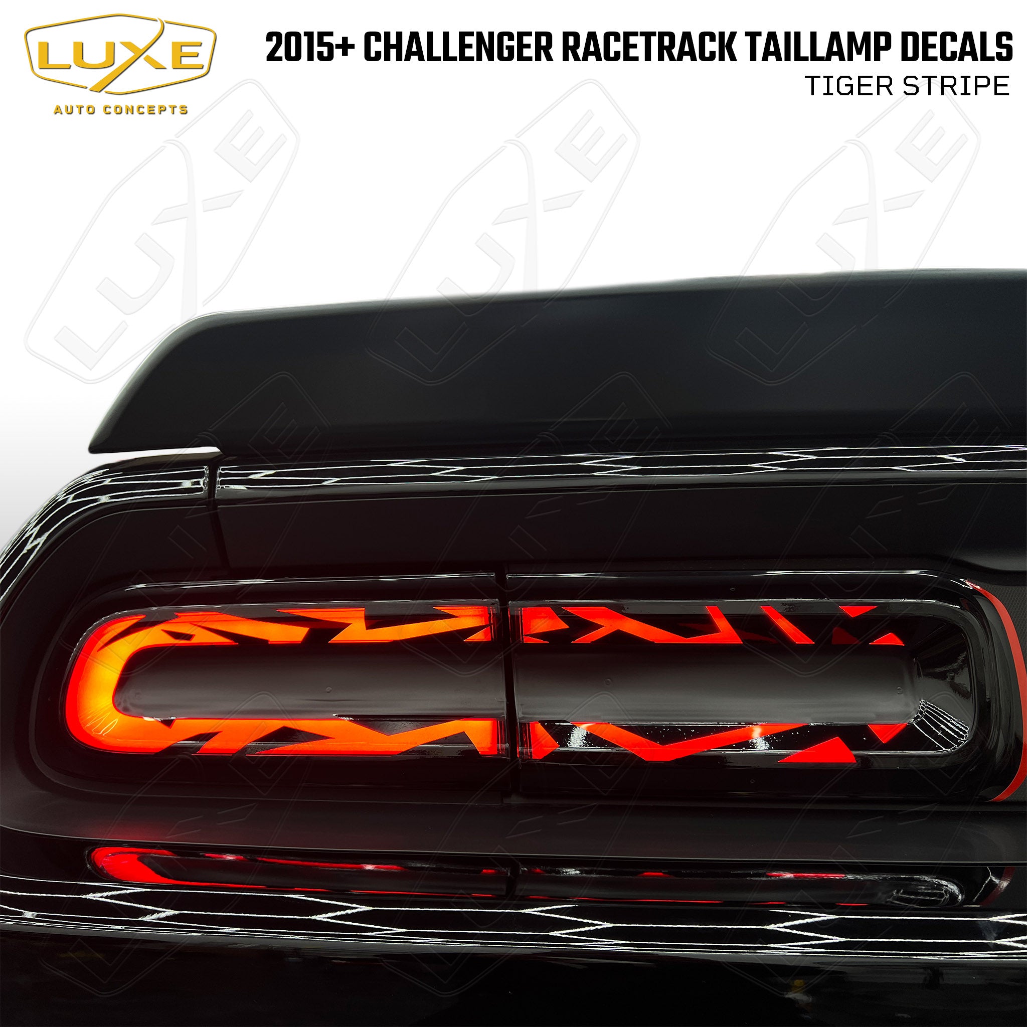 Stand out from the crowd & give your 2015-2023 Dodge Challenger a super unique look with Luxe's signature Tiger Stripe decals. This decal can be made from 2 types of vinyl- KPMF Perfect Black, which is the best match to the plastic on the taillights and it blocks more light than other vinyl; or Luxe LightWrap Dark Smoke, which will give you a more subtle custom look. All you do is clean the light and install. No mixing a soapy solution here!