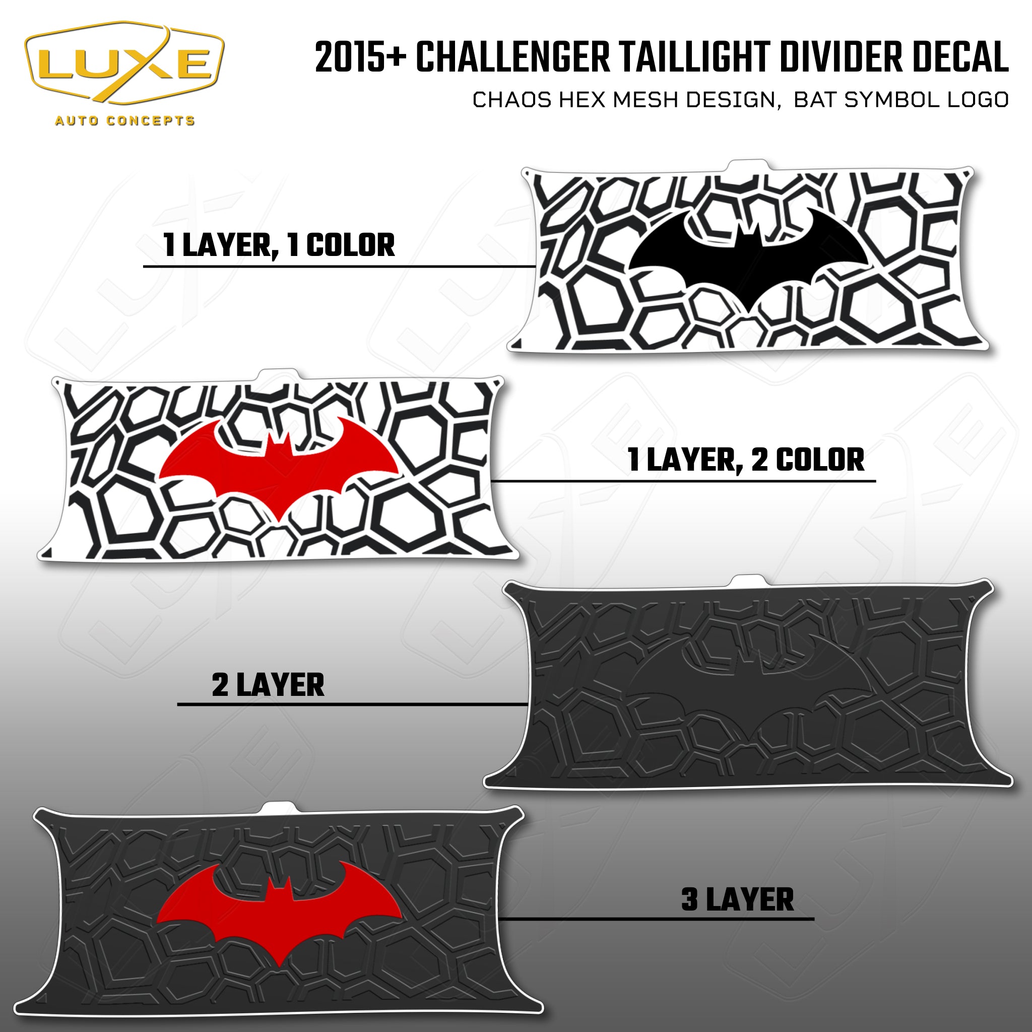 2015+ Challenger Taillight Center Divider Decal - Chaos Hex Mesh Design, Bat Symbol Kit