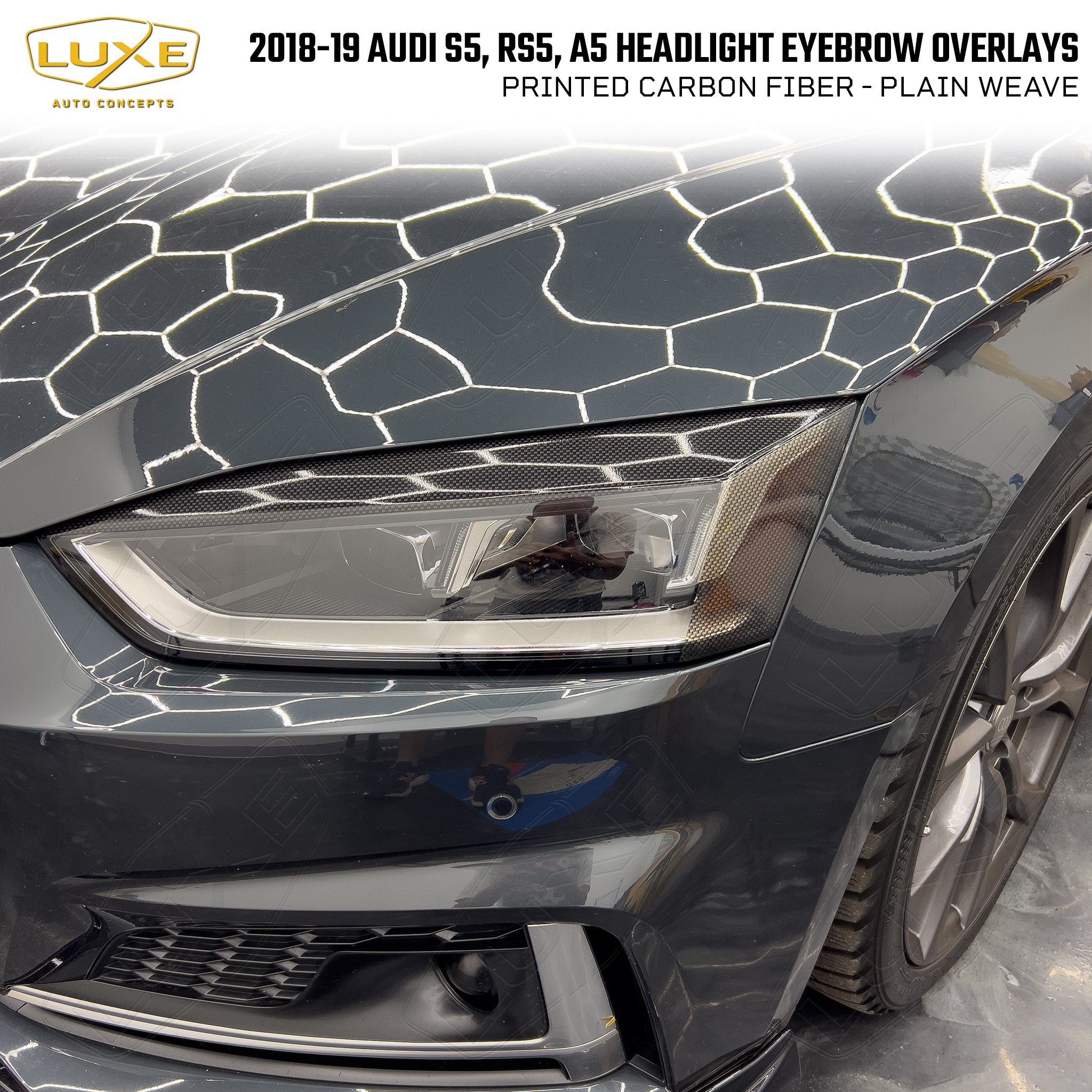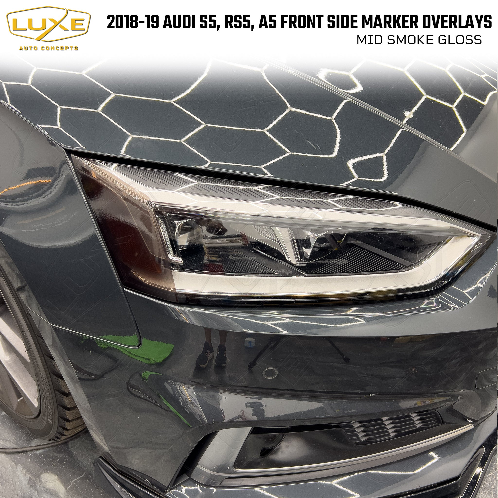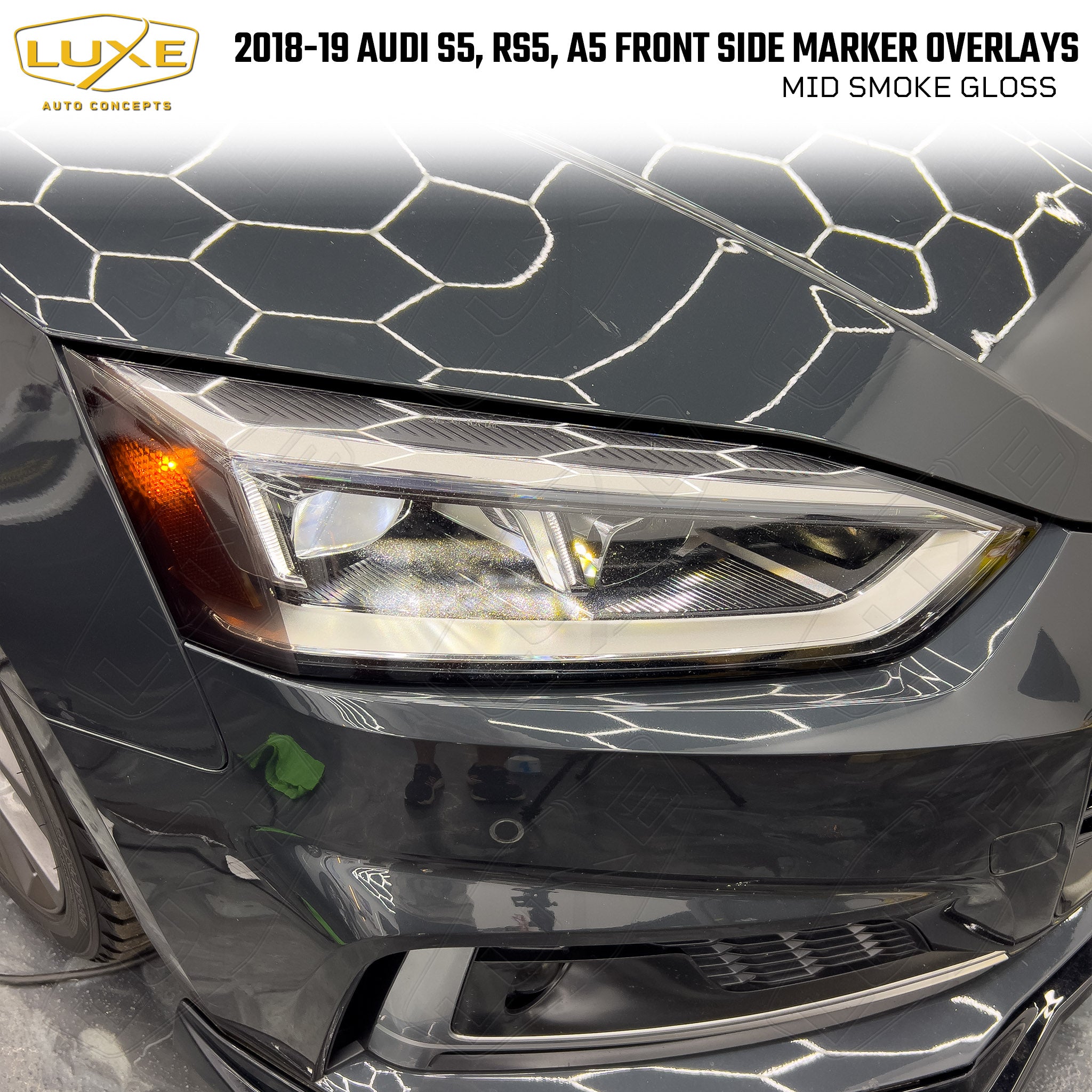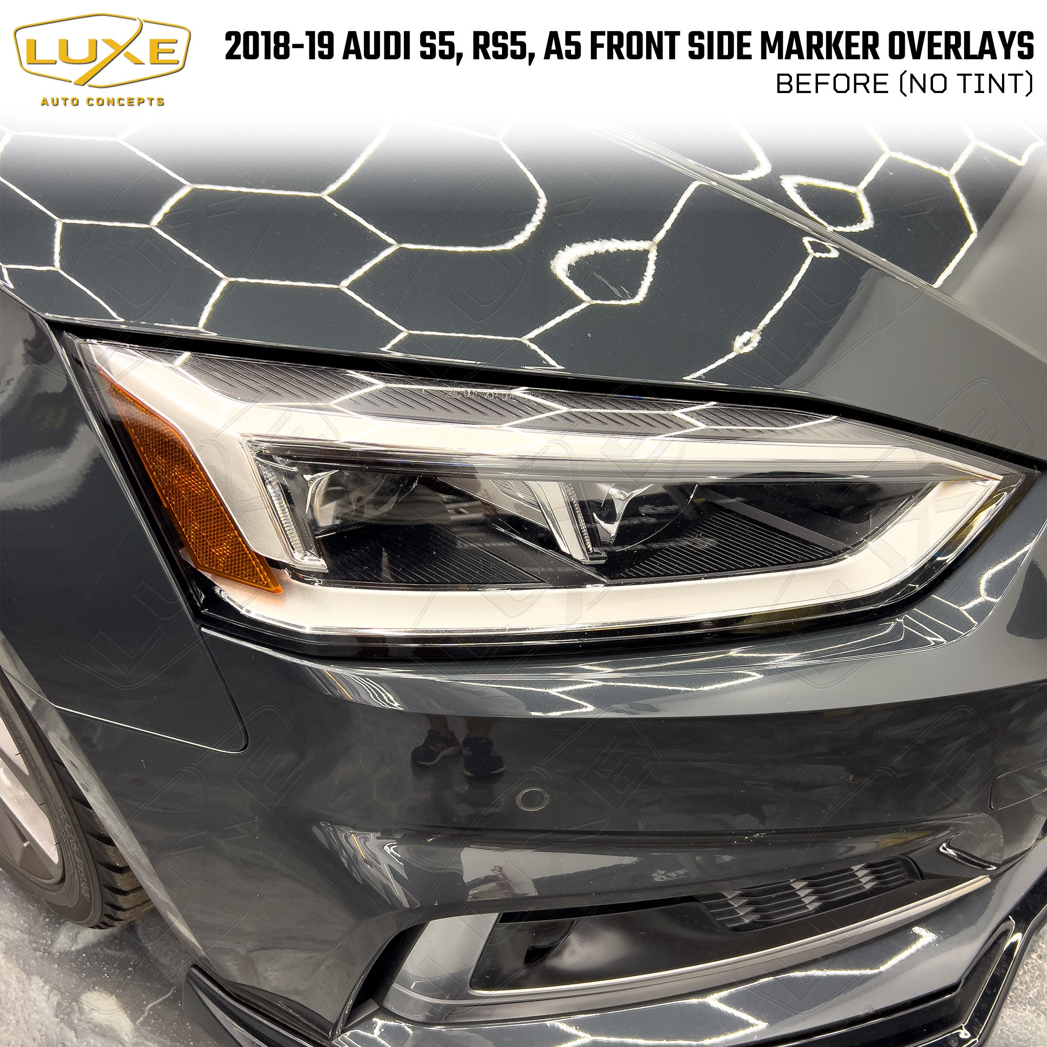 This 2-piece front side marker/indicator tint kit includes custom fit overlays for your 2018+ Audi RS5. Everything from the shape of the overlay to the LightWrap tint is designed by Luxe to be the best on the market. We make these overlays using the same LightWrap vinyl that we sell to professional installers all over the world. It will not shrink and crack like calendar vinyl or Chinese-made vinyl, and can be removed without causing any damage to the vehicle.