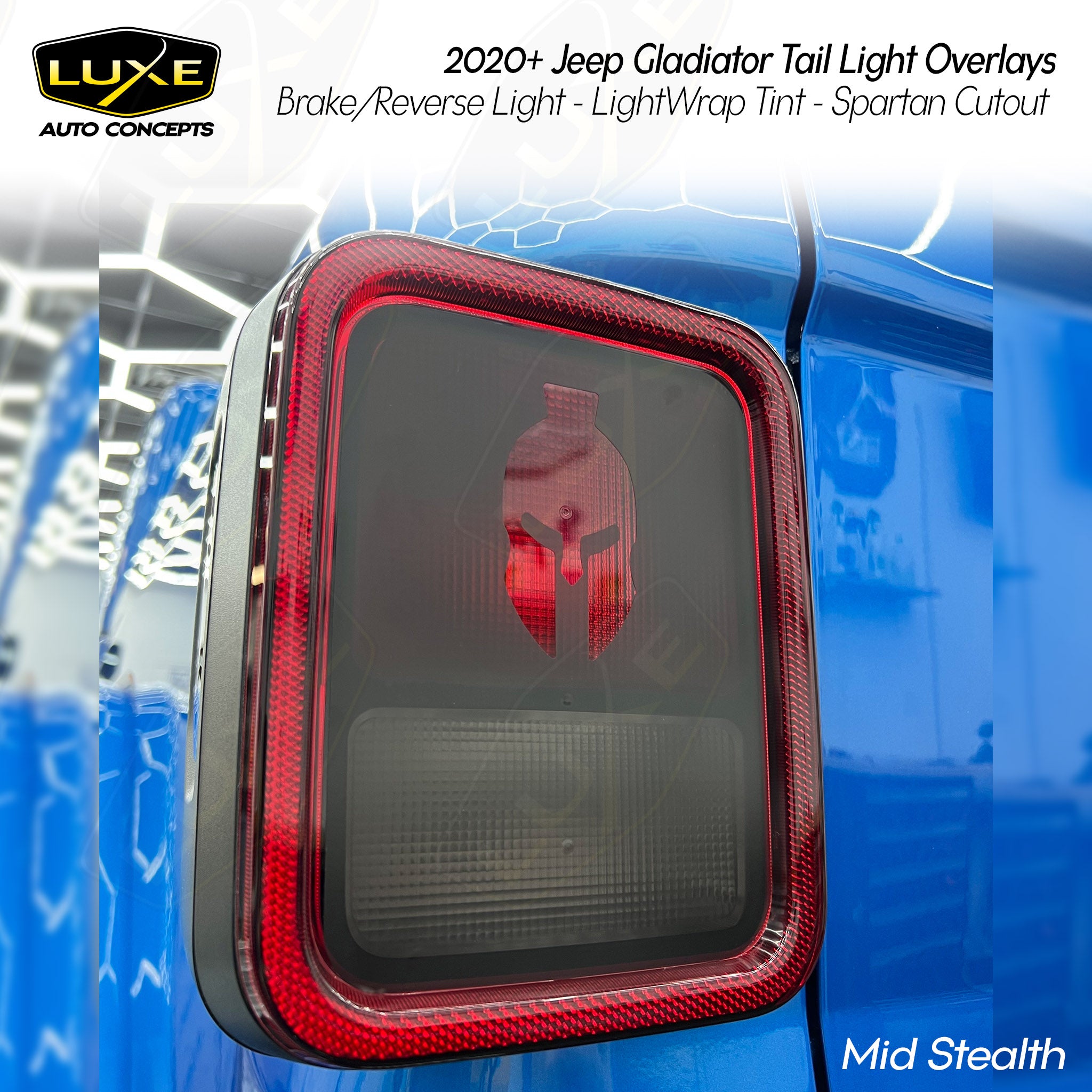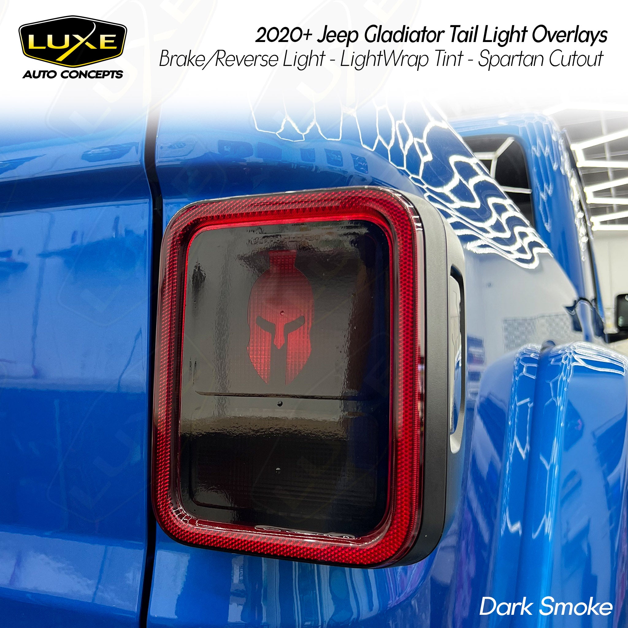 This 2-piece tail light brake/blinker light tint kit includes custom fit overlays for your 2020+ Jeep Gladiator.  Everything from the shape of the overlay to the choice of quality vinyl is designed by Luxe to be the best on the market.  We make these overlays using the same cast vinyl you'll find in professional shops around the world.  It will not shrink and crack like calendar vinyl or Chinese-made vinyl, and can be removed without causing any damage to the vehicle.