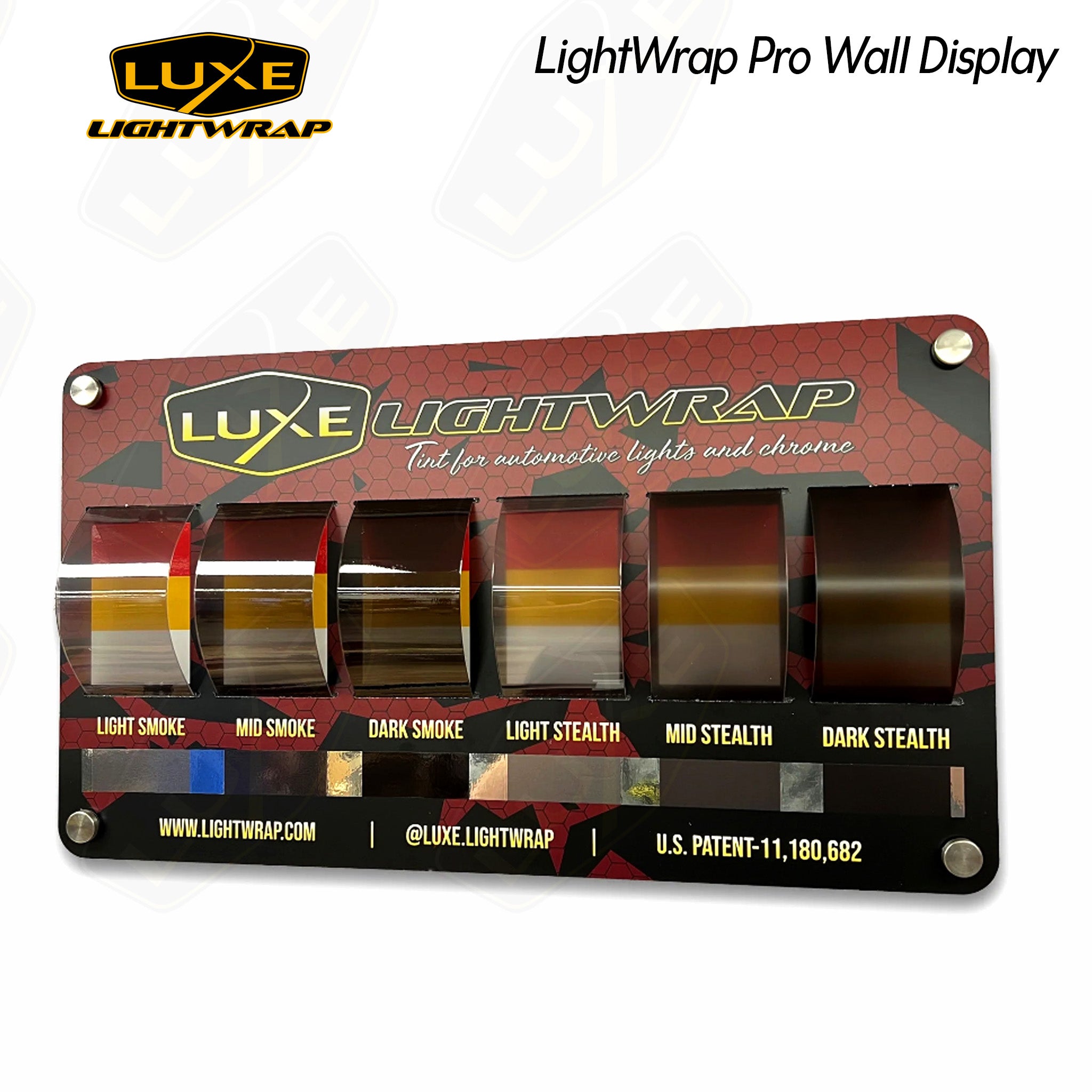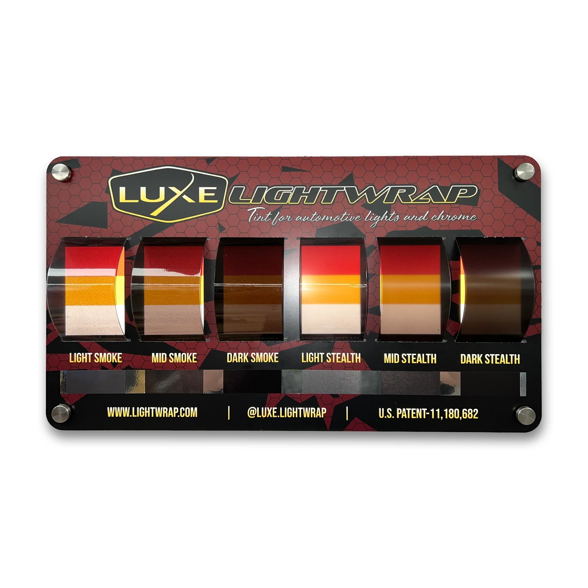 Let people know that you are a Luxe LightWrap™️ installer with this aluminum foam core display! Featuring our six basic shades on clear, flexible acrylic panels, as well as wrapped over chrome. The display measures 21 inches wide, 12 inches tall, and 1/2 inch thick.