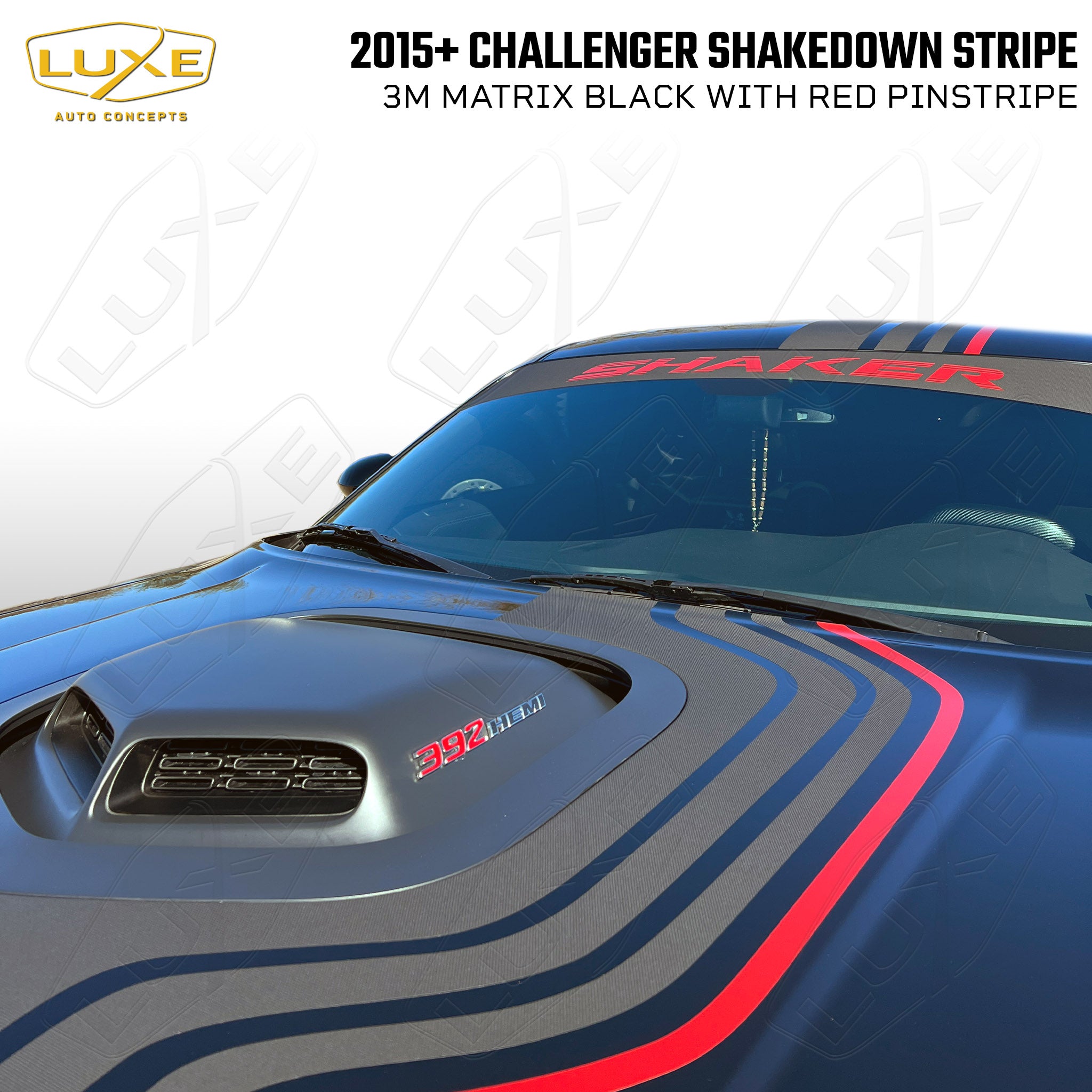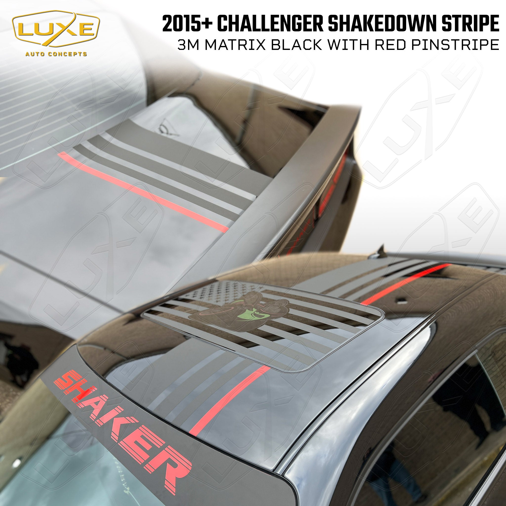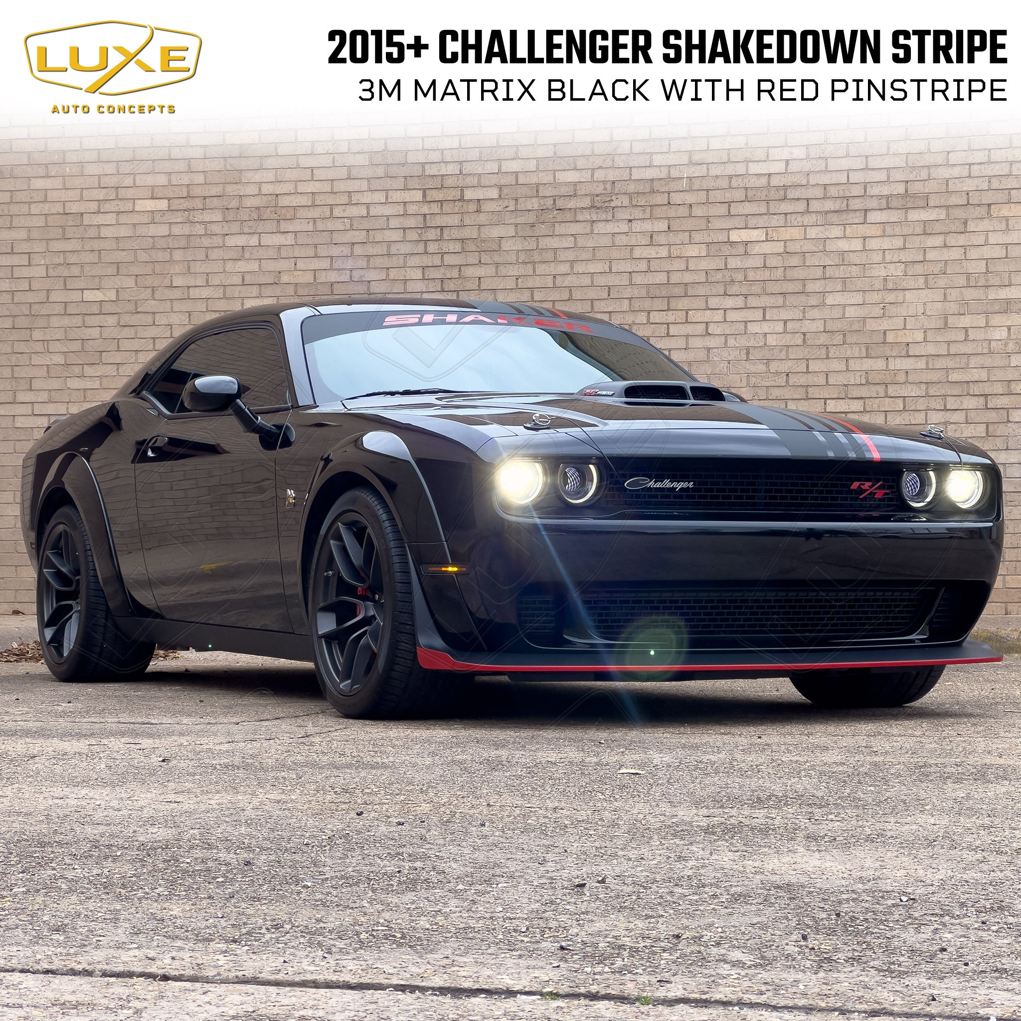 This Shakedown Stripe decal is for 2015-23 Dodge Challengers with a Shaker hood. You don't have to have a limited-edition car to get the OEM look of the 2023 Shakedown package with this kit by Luxe. This decal was designed in-house for perfect fitment and is made from quality cast automotive wrapping vinyl featuring air-egress technology for a fast, bubble-free install.
