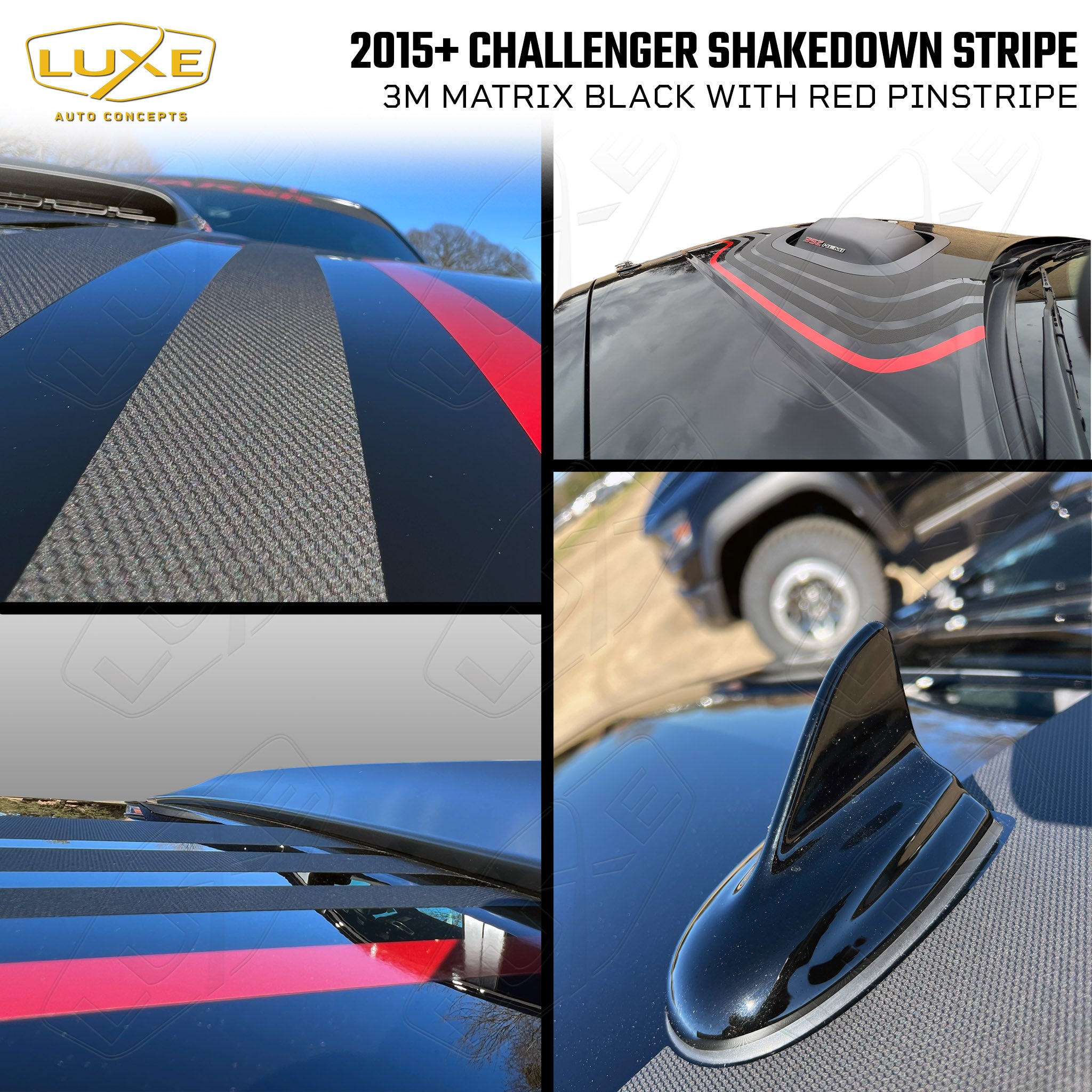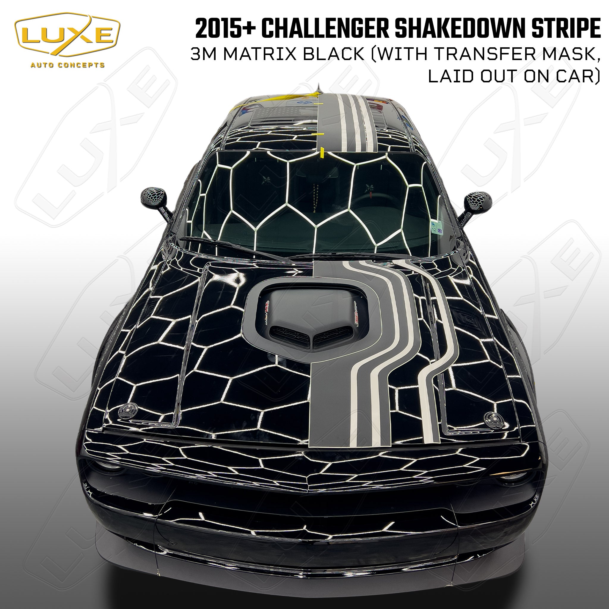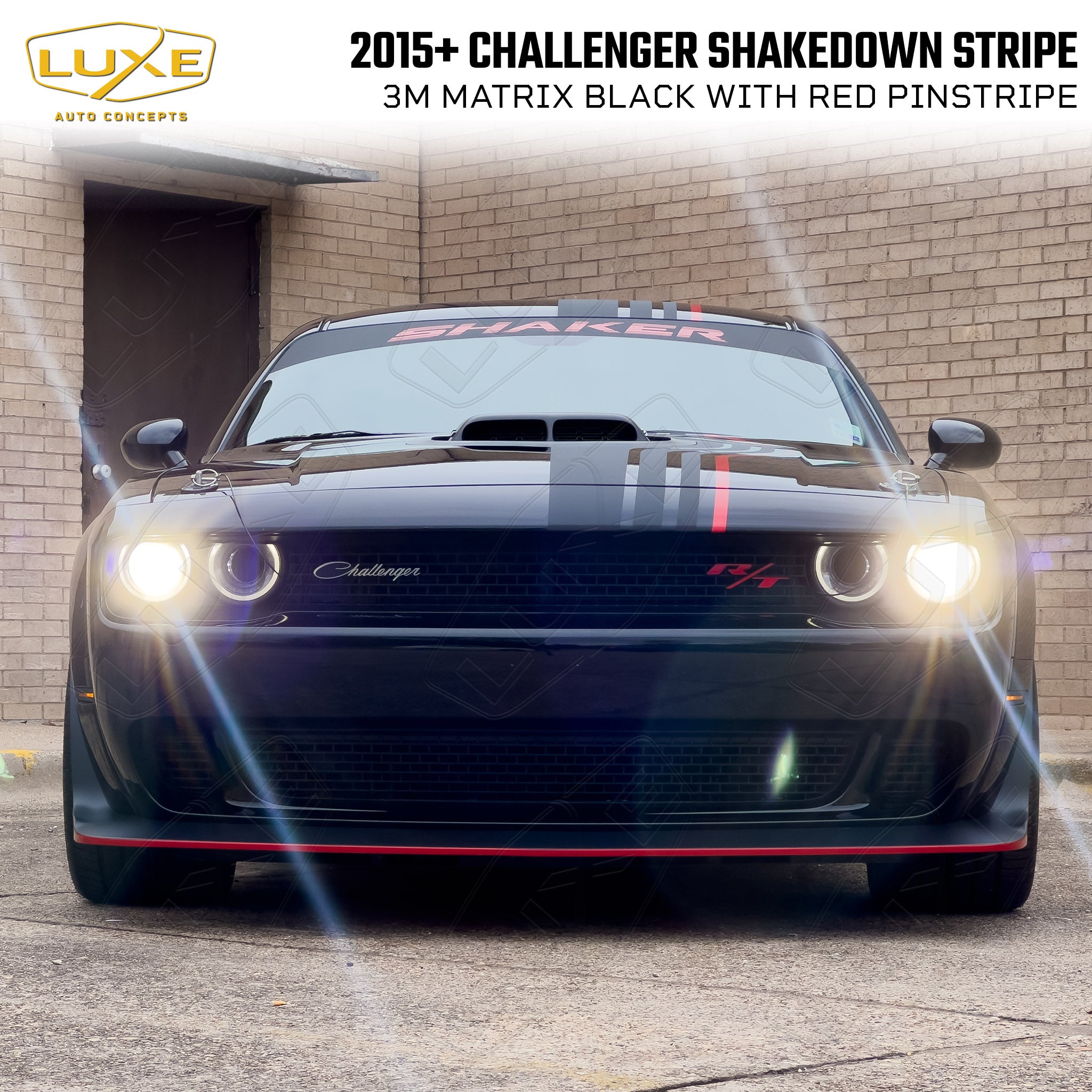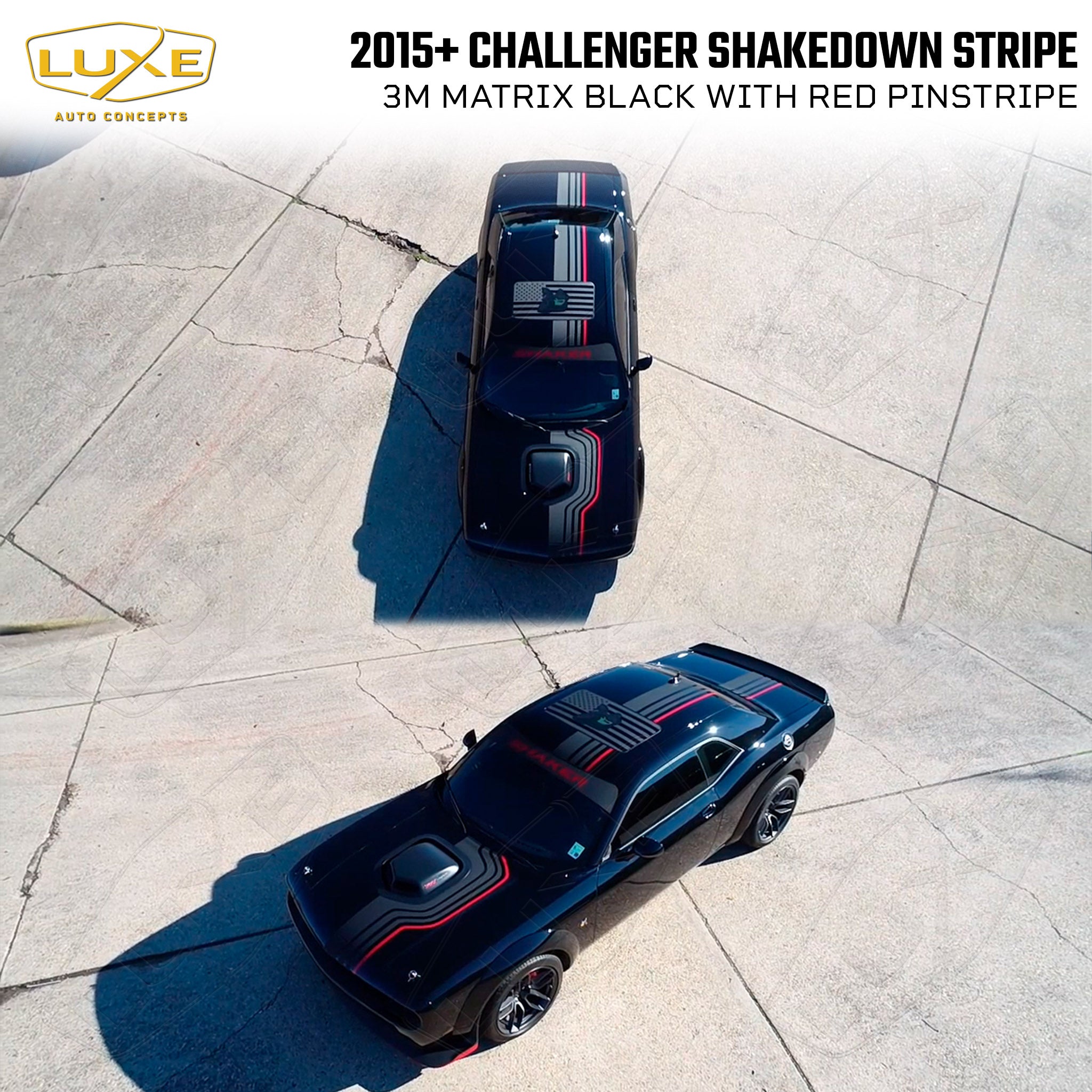 This Shakedown Stripe decal is for 2015-23 Dodge Challengers with a Shaker hood. You don't have to have a limited-edition car to get the OEM look of the 2023 Shakedown package with this kit by Luxe. This decal was designed in-house for perfect fitment and is made from quality cast automotive wrapping vinyl featuring air-egress technology for a fast, bubble-free install.